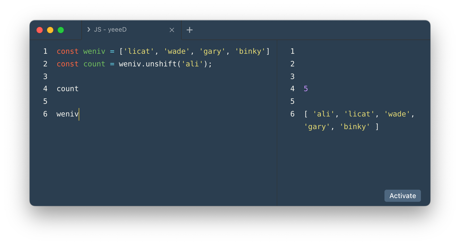 - unshift() 메서드는 배열의 맨 앞에 1개 이상의 요소를 추가할 수 있다