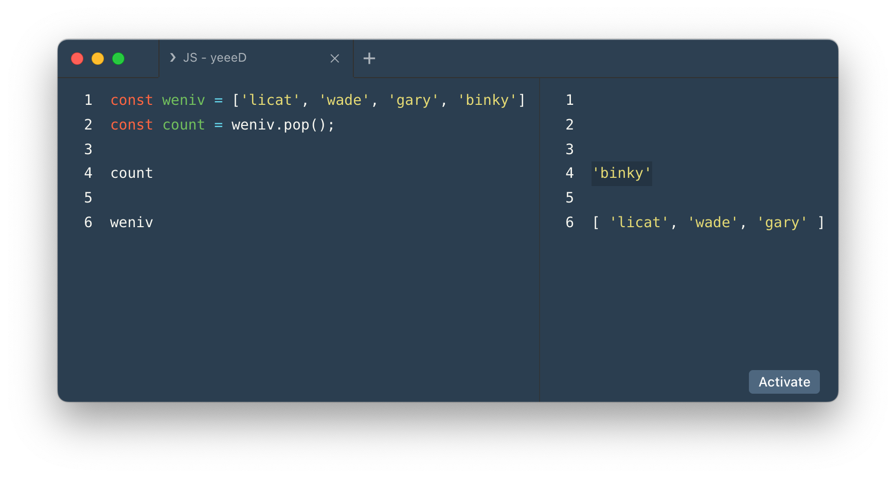 - 두 번째 매개변수에 2를 주었으므로 'binky'가 삭제되었다